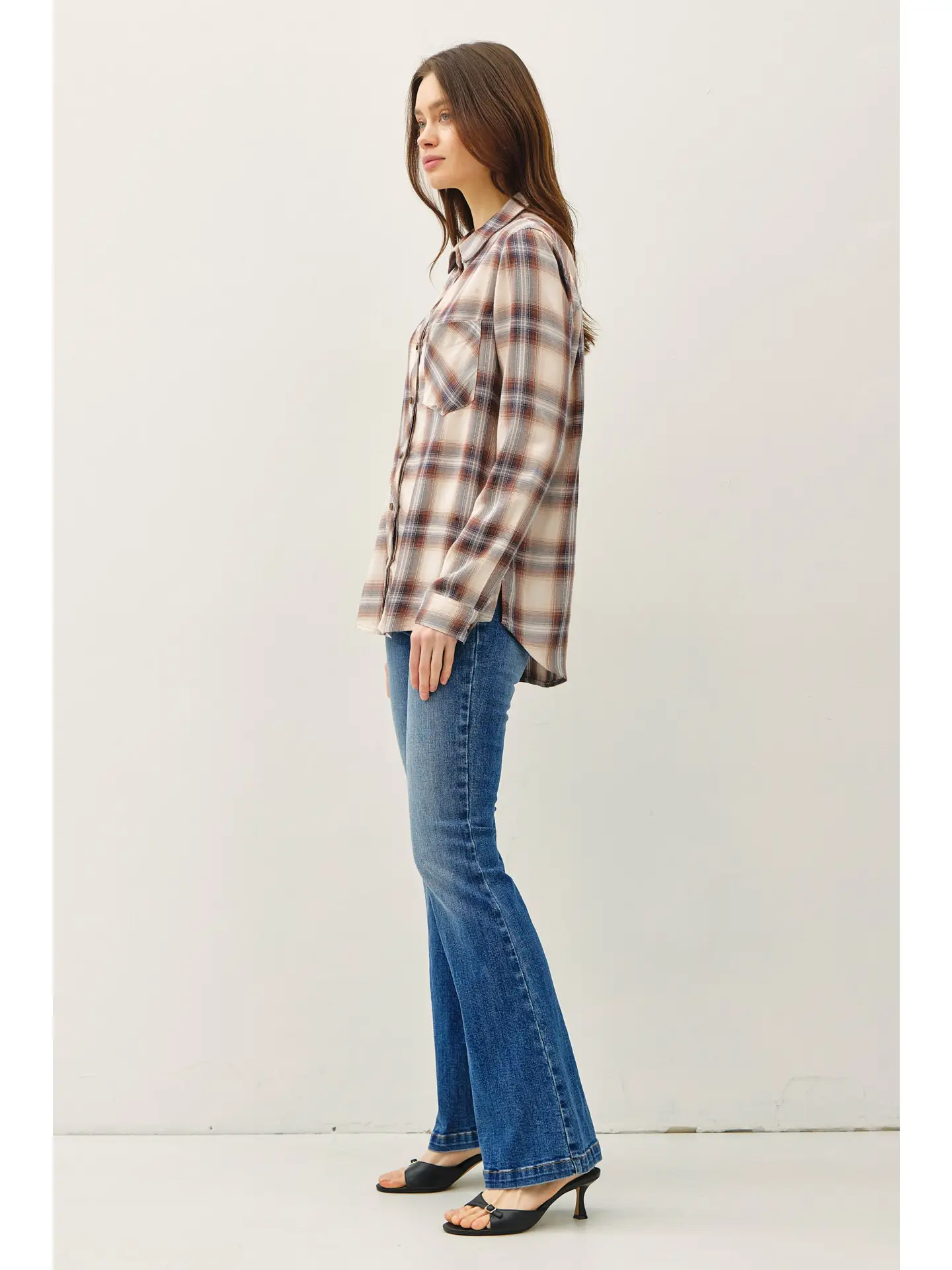 A timeless staple for every season, this soft plaid button-up features warm tones of cream, brown, and blue for an effortlessly casual look. Designed with a relaxed fit and a front chest pocket, it pairs perfectly with your favorite denim for a laid-back yet polished vibe. Wear it open over a tee or buttoned up for a cozy, put-together finish.