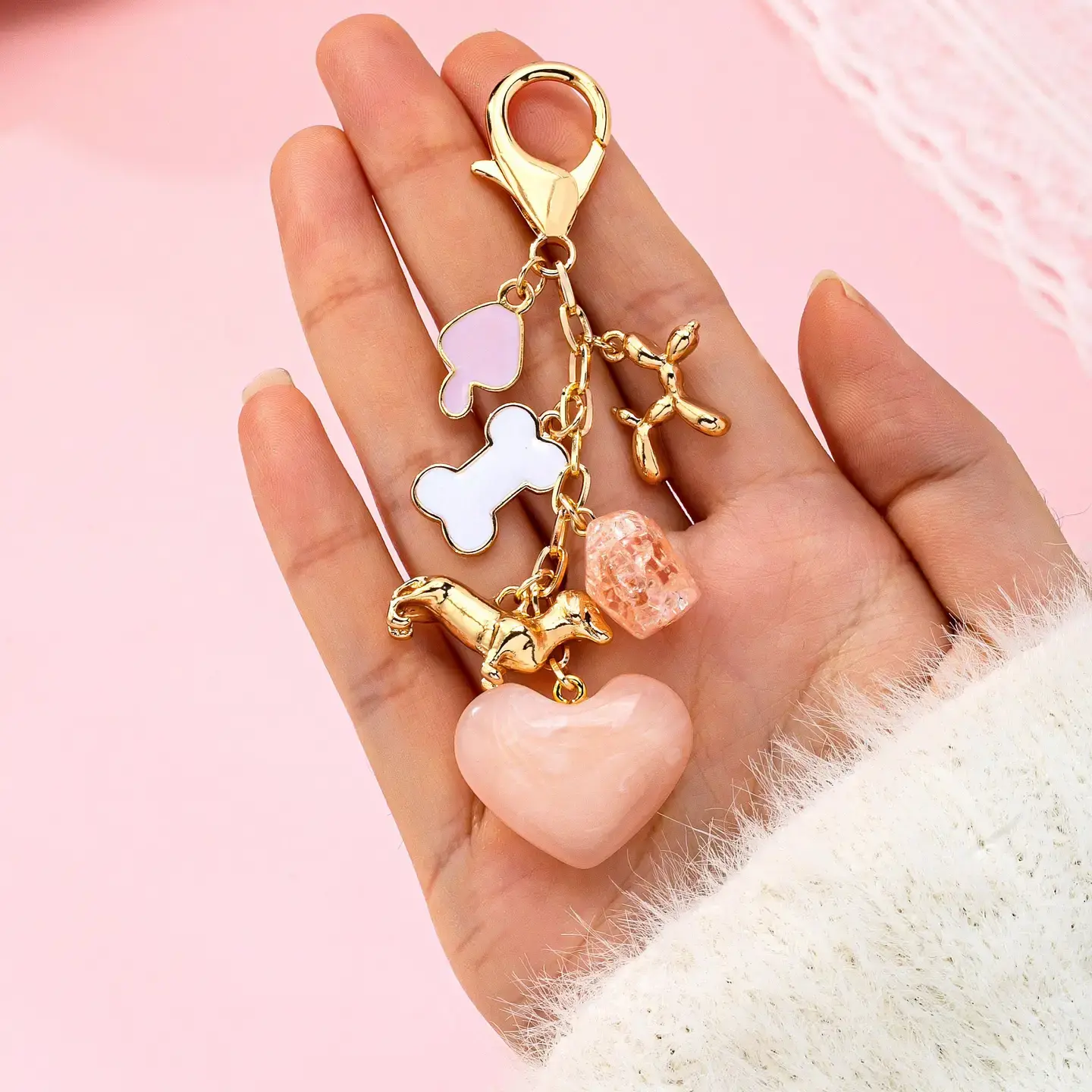 Featuring a cute heart-shaped acrylic, dog, bone charms attached.