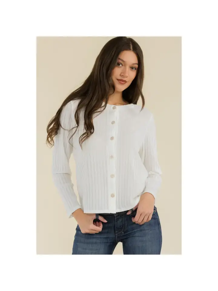 A timeless essential for effortless elegance, this ribbed knit cardigan brings subtle texture and refined simplicity to your wardrobe. Crafted from a soft, lightweight fabric, it features a classic round neckline and a straight hem for a polished silhouette. The front button closure with matching tonal buttons adds a touch of sophistication, making it perfect for layering over your favorite tops or dresses.