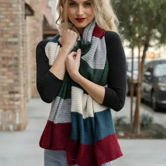 Cozy up in color with this striped knit scarf, featuring wide bands of deep green, wine red, navy, cream, and soft grey. Made from a thick, ribbed knit, it offers warmth without sacrificing style. Perfect for layering over your favorite fall sweaters or a simple long-sleeve tee, this scarf brings a touch of effortless charm to chilly days. A must-have for the season’s wardrobe — soft, bold, and endlessly versatile.