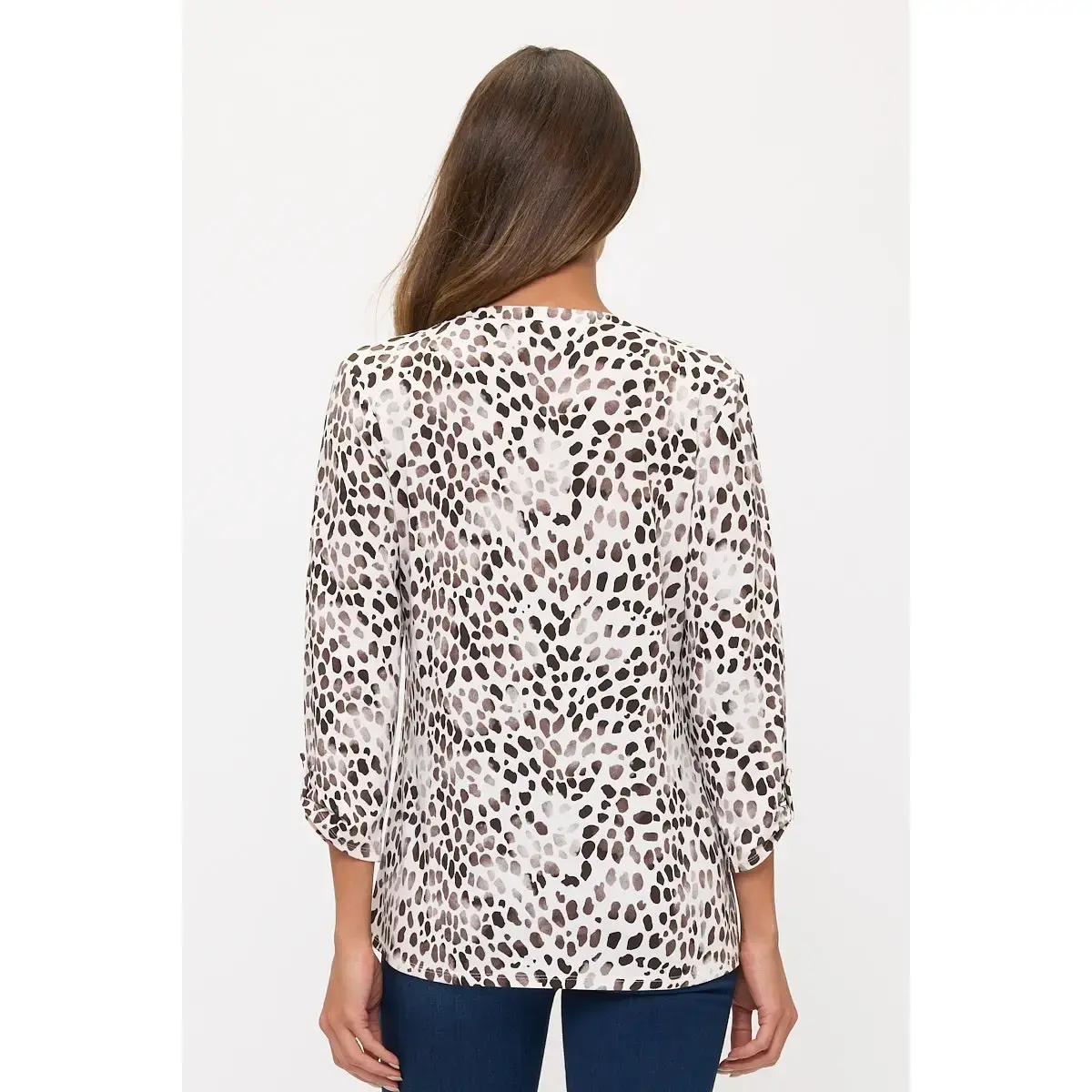 Effortlessly chic and versatile, this abstract spot print blouse is a modern wardrobe essential. The neutral palette of ivory, taupe, and soft brown creates a subtle yet eye-catching pattern that transitions seamlessly from day to night. Designed with a flattering V-neckline and delicate button detail, this blouse offers a touch of sophistication with ease.