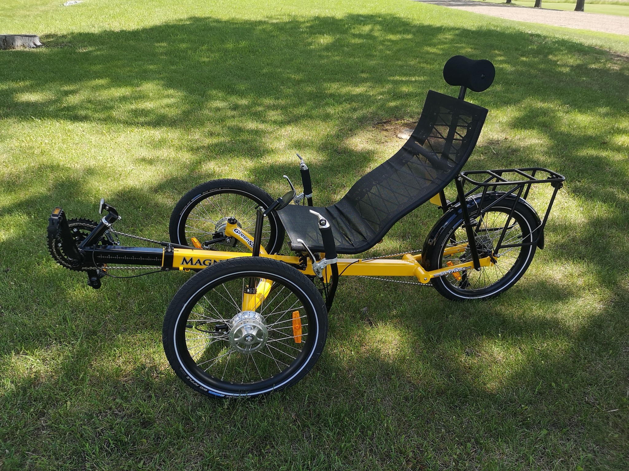 To further enhance the ride, the Magnum uses the 2 inch wide Schwalbe Big Apple balloon tires. These tyres are designed to be run at any pressure from 35 to 70 psi on an ordinary bike. However, as the wheel loading is much less on GreenSpeed trikes, due to the even weight distribution, these tyres may be safely run as low as 20 psi, to give soft ride without much increase in rolling resistance. And while most aluminium bikes have a harsh ride, the Magnum prototypes were made in Cro Mo steel, and then every frame tube was translated by engineers to give the same stiffness in aluminium. Thus the 7005 aluminium Magnum frame has exactly the same ride stiffness the original Cro Mo prototype, one of which was tested in the Himalayas. Then the wider seat of the XL further enhances the comfort brought about by the careful design of the seat, tires, and frame.