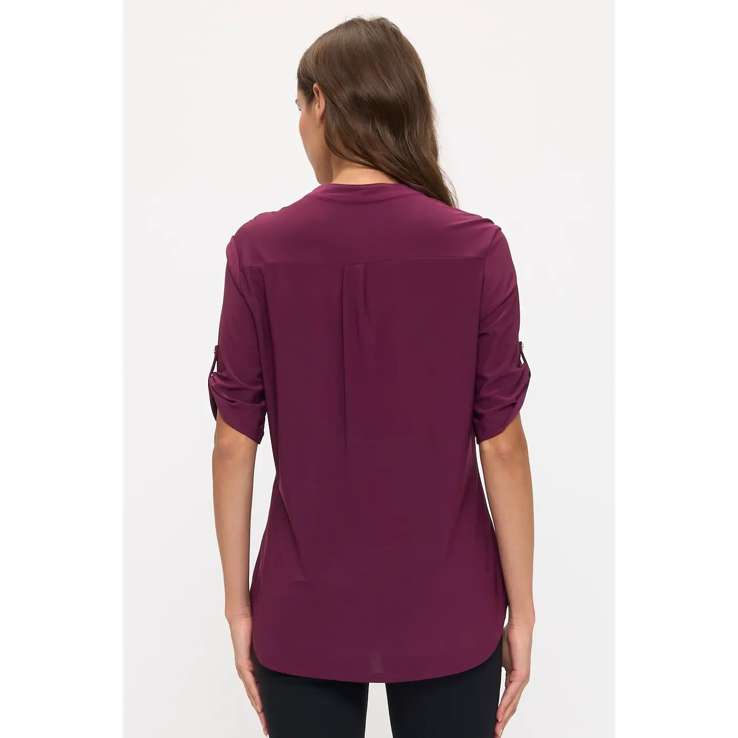 A refined essential designed for effortless everyday style. This blouse features a flattering V-neckline with a button-front placket, offering a clean and polished look suitable for both work and casual settings. The roll-tab sleeves add versatility, allowing for easy styling throughout the day.