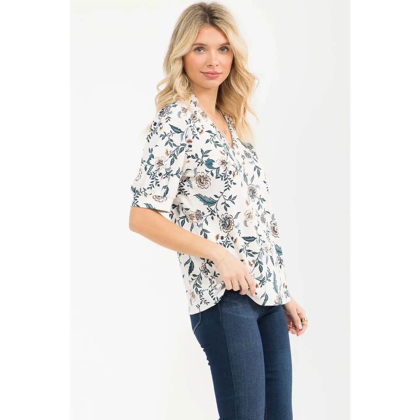 Moss Crepe Half Placket Puff Tee - Ivory Teal