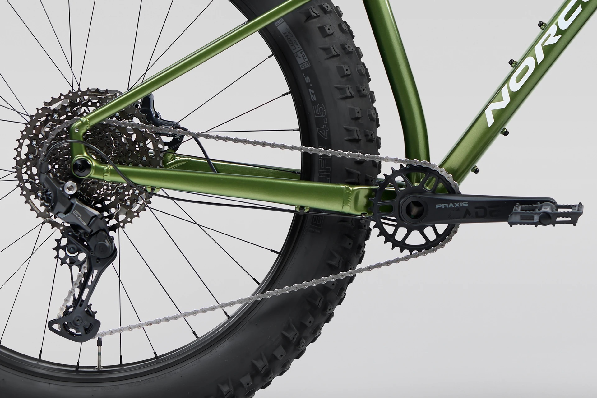 - 27.5x4.5” tires for max traction and floatation in the deep stuff.