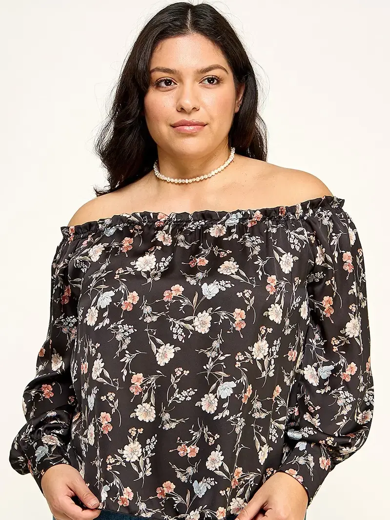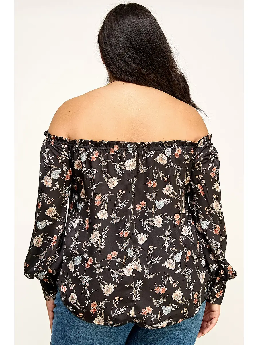 Plus Size Floral Off Shoulder Satin Blouse - Black