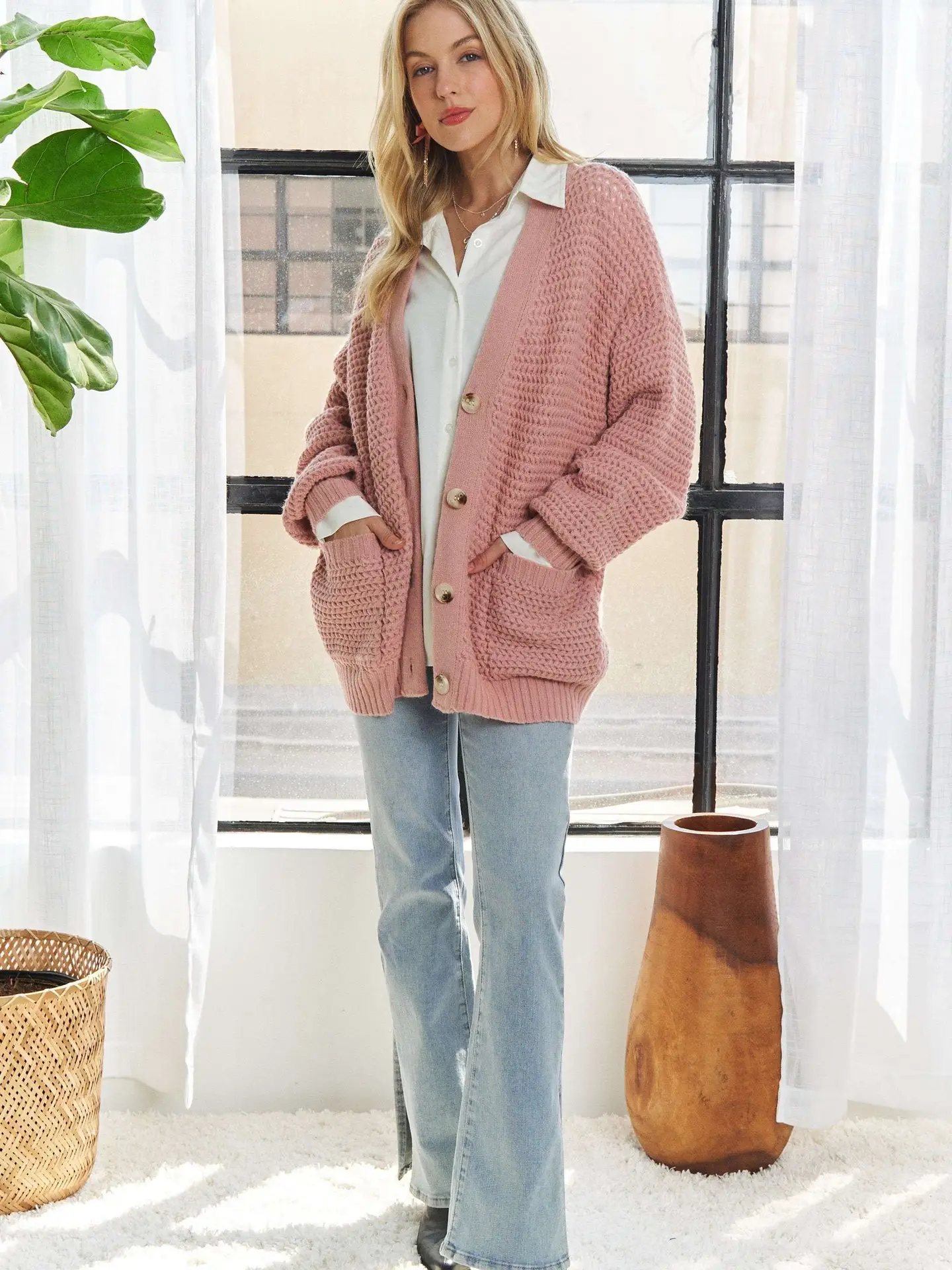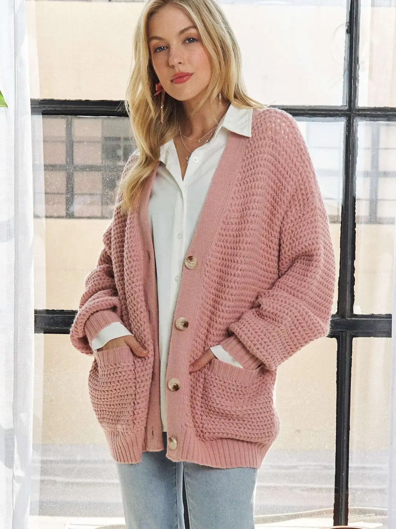 Wrap yourself in cozy charm with this soft blush knit cardigan. Featuring a chunky textured weave, front patch pockets, and classic button closure, this piece brings warmth and effortless elegance to any outfit. Its relaxed fit makes it perfect for layering over blouses or tees — from workdays to weekends, it’s the ultimate blend of comfort and style.