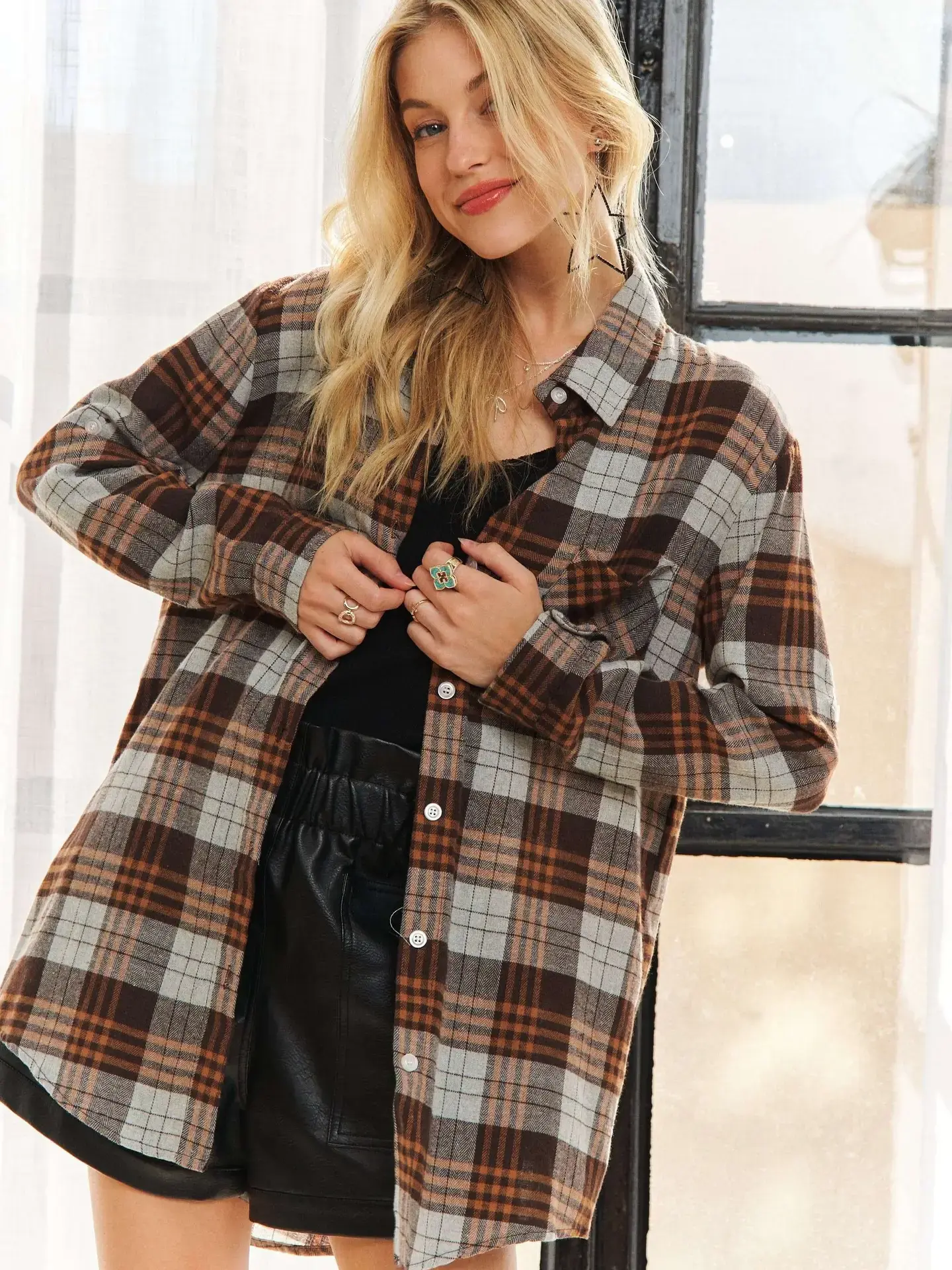 Channel effortless cool with our Rylee Plaid Button-Down Shirt, the perfect layering piece for transitional seasons. Crafted from soft brushed fabric, this shirt offers cozy comfort with a timeless plaid pattern in rich tones of brown, cream, and gray. The relaxed silhouette and classic button-up design make it a versatile staple that pairs beautifully with everything from jeans to skirts.